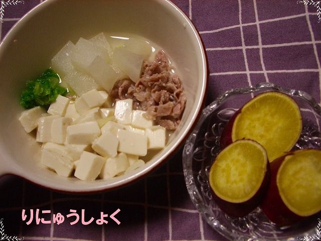 3回目豚鍋 豚肉、豆腐、白菜、長ネギ、大根さつまいも豚鍋の作り方1.材料を切ります。2.昆布だしに材料を入れて煮込みます。大人には中華そば。あやちゃんにはうどん。の予定でしたが…。うどんがなかった(冷蔵庫にあるもんと思い込んでいた)おかゆもない。大人用に炊いたご飯もない。さつまいもがあったので、それで我慢してもらいました。 2009年10月16日