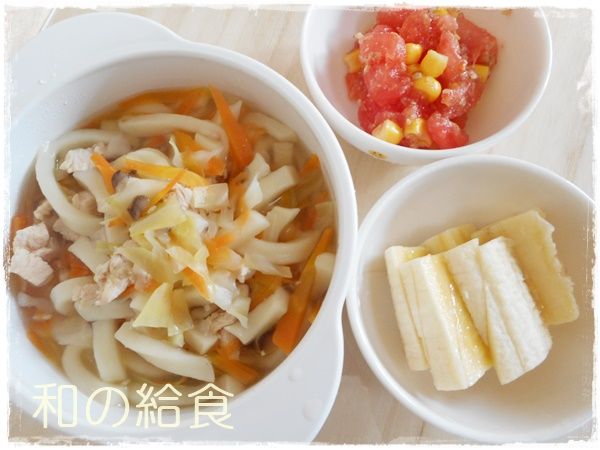(だし400 うどん90g、鶏むね肉20 キャベツ5、にんじん10 しいたけ50