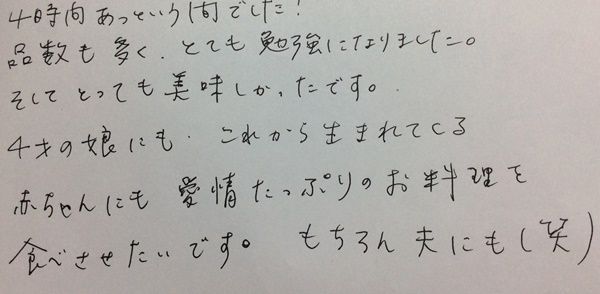 4時間あっという間でした!品数も多くとても勉強になりました。そしてとっても美味しかったです。4歳の娘にも、これから生まれてくる赤ちゃんにも、愛情たっぷりのお料理を食べさせたいです。もちろん夫にも(笑)
