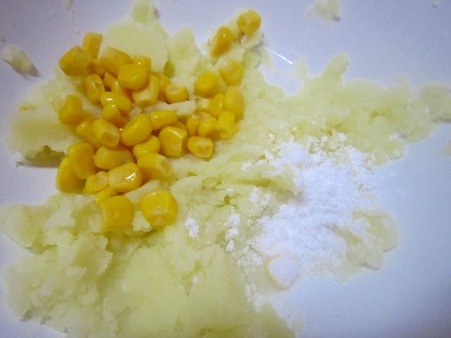 2.じゃがいもを潰して、コーン(大さじ1)と片栗粉(小さじ1)を混ぜ混ぜします。